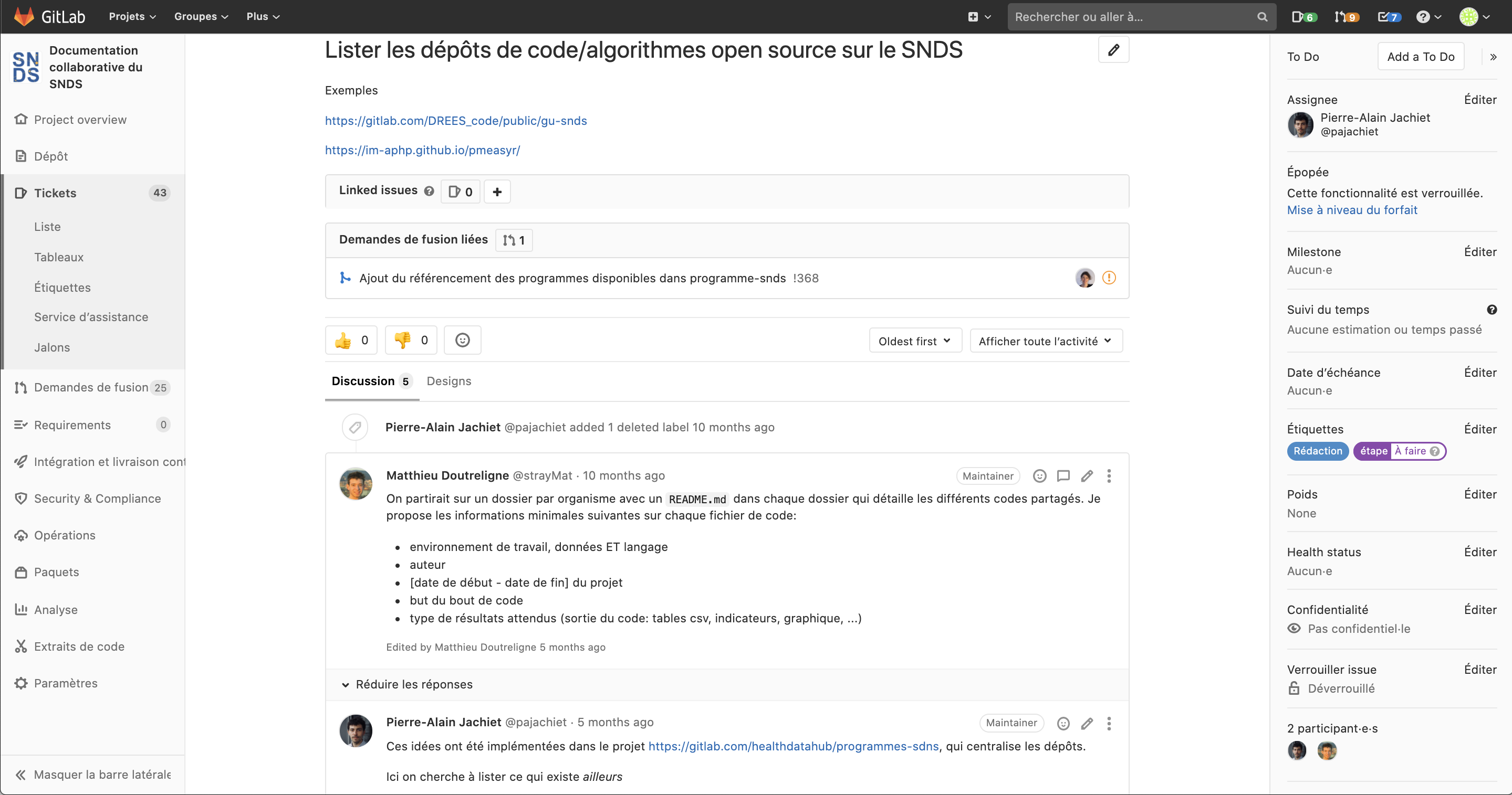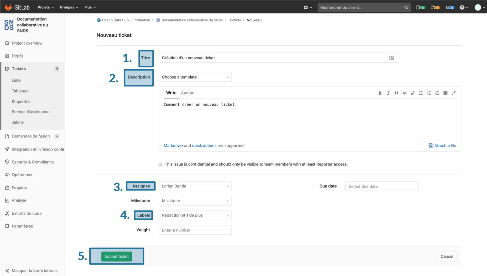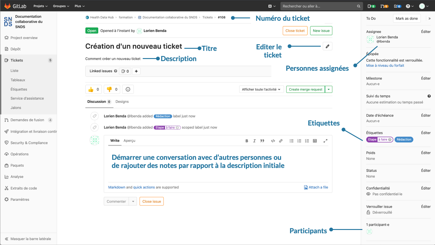 Une fois, le ticket validé, ce dernier comporte un titre, une description. Une liste des personnes assignées est disponible dans le menu à droite et est éditable en cliquant sur éditer. Il est également possible d'éditer les étiquettes. Une conversation peut démarrer en utilisant l'outils commentaire (le format markdown peut être utilisé lors de l'édition de commentaires).