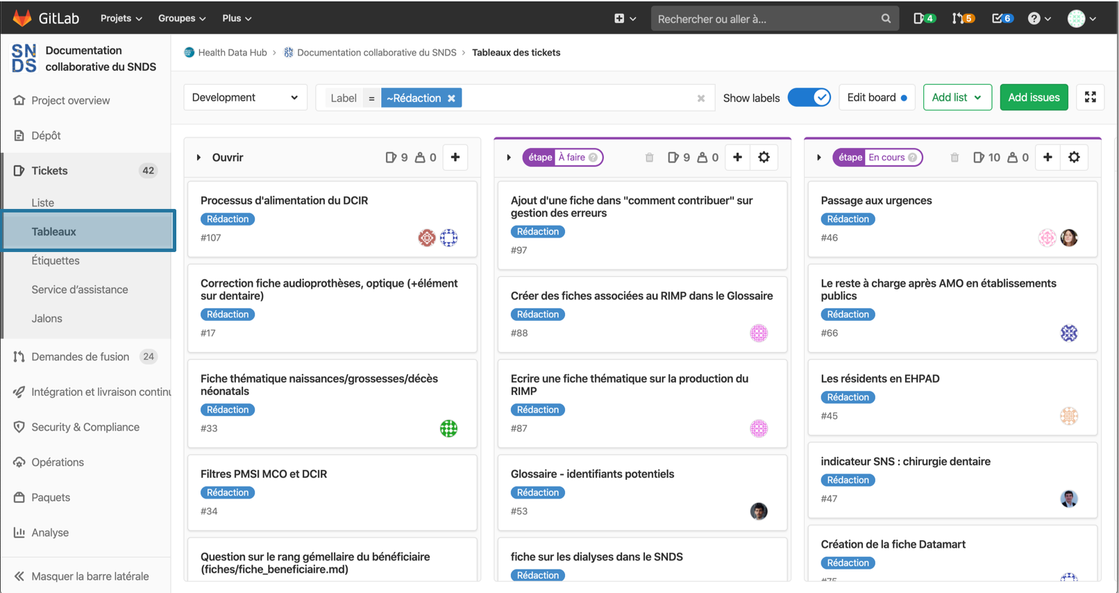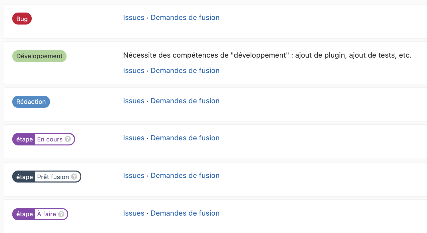 documentation collaborative, les étiquettes disponibles sont Rédaction, Développement, Bug,A faire, En cours, Prêt fusion