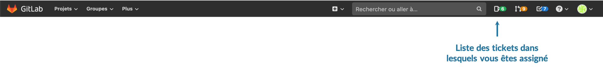 Pour retrouver un ticket dans lequel on s'est assigné, il faut aller dans la barre de navigation de Gitlab et cliquer sur le bouton vert Tickets (cet onglet est juste à droite de la barre de recherche)