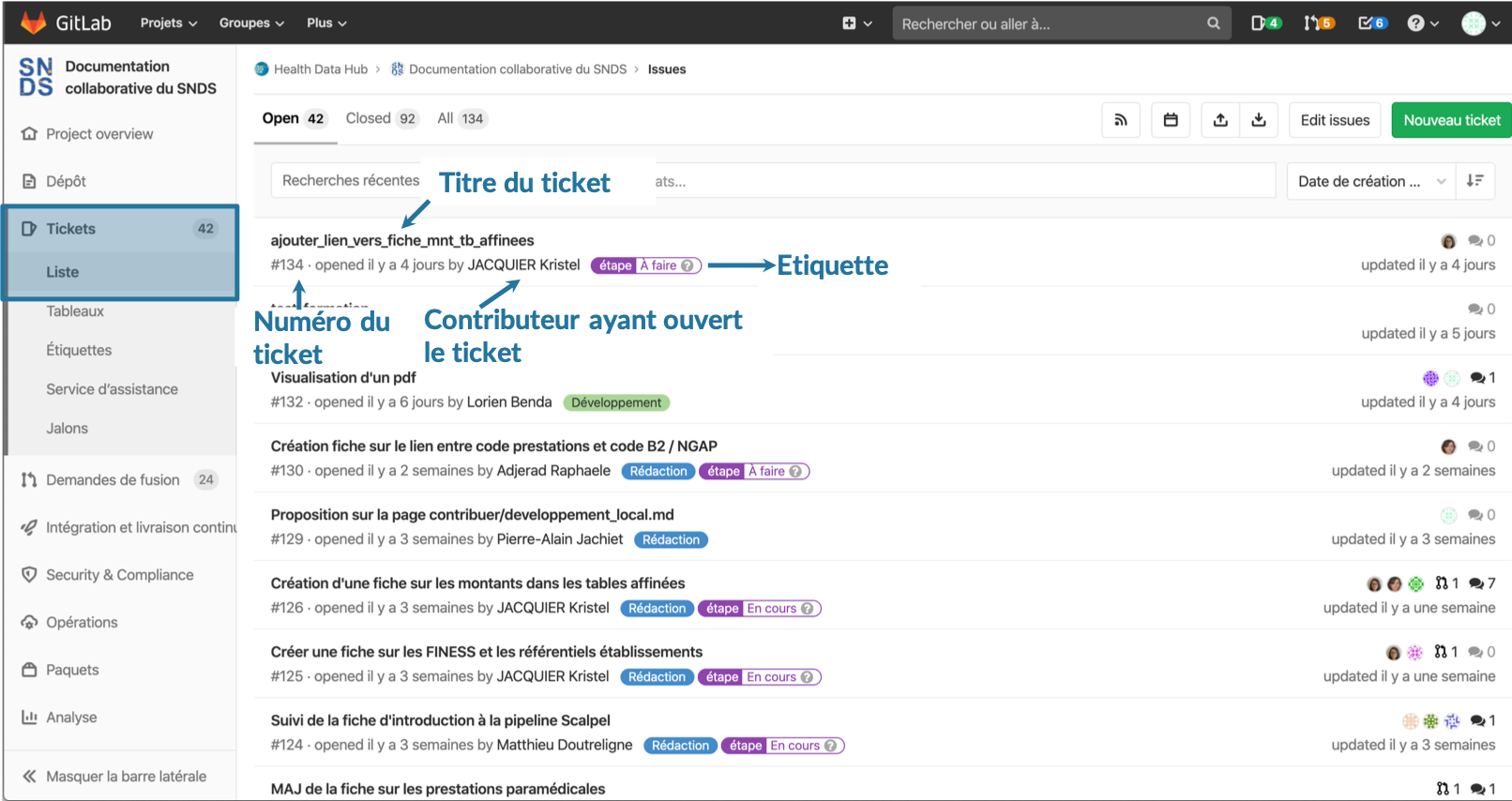 Les tickets sont des outils de communications autour du projet de la documentation. Ils peuvent être utilisés pour proposer un nouveau sujet de fiche, proposer des modifications dans une fiche, signaler une erreur, signaler un bug dans les outils. Ils peuvent être attribués à une ou plusieurs personnes en désignant des assignés. Les tickets comportent une section commentaires, permettant de commencer une discussion avec les différents participants du ticket.