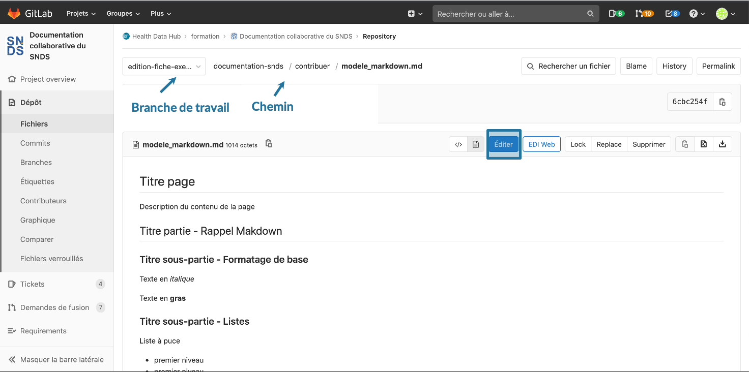 Pour trouver la fiche à modifier, aller dans Dépôt > Fichiers et sélectionner la branche de travail précédemment utilisée.