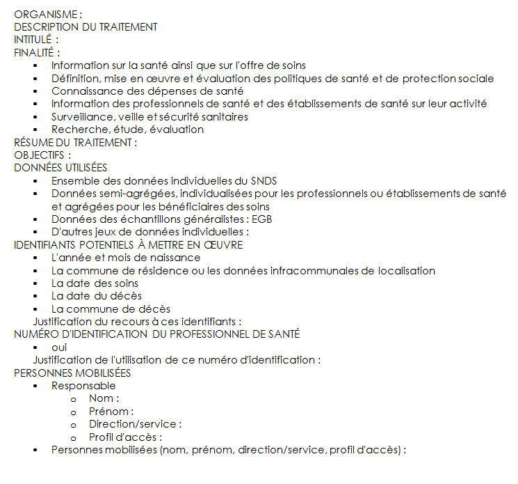 Conformément à l’arrêté du 6 avril 2017, un document-type est porté en modèle afin que le Délégué à la Protection des Données (DPD), présent dans chaque organisme, puisse tenir un registre précisant les caractéristiques des traitements portant sur des données individuelles du SNDS. Le DPD doit veiller à la traçabilité des traitements réalisés par la tenue de ces registres (enregistrement des utilisateurs, des projets).